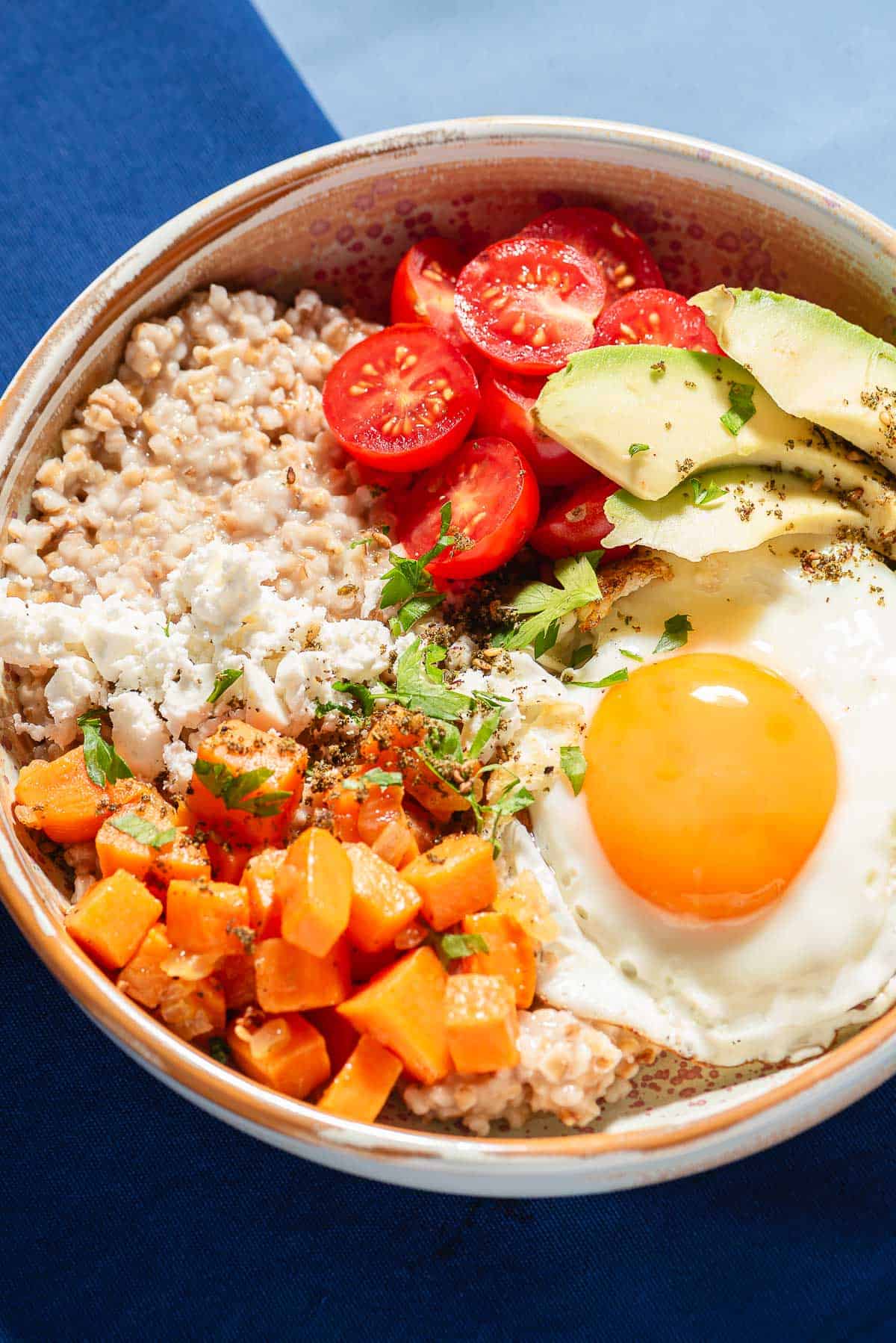 - Assemble the savory oatmeal bowls. Spoon some cooked oats into each bowl. Add in the sweet potatoes and a cooked egg. Finish each with some of a diced avocado, a handful of halved cherry tomatoes, chopped fresh parsley, crumbled feta cheese, and a sprinkle of za’atar. Serve immediately.
